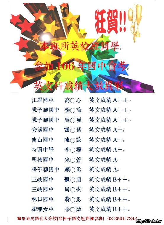國中會考英文成績亮眼