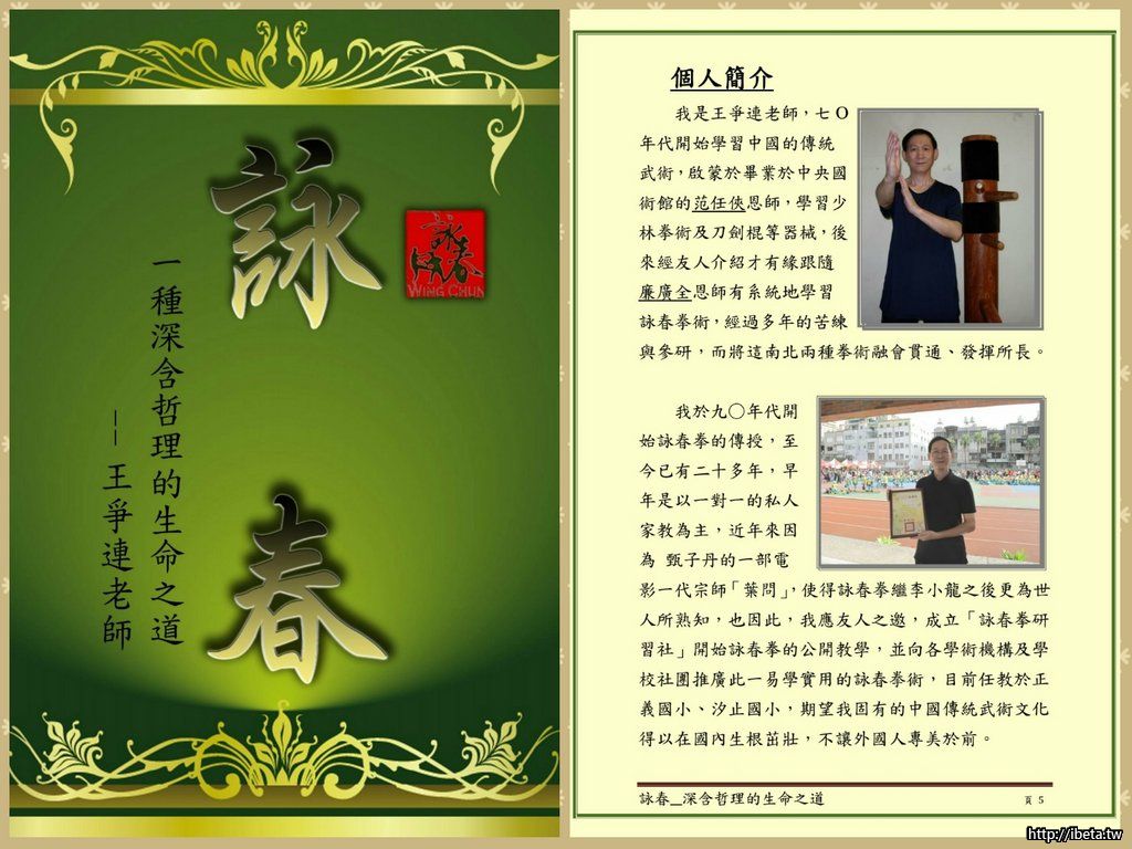 王爭連老師,師承 范任俠(北拳-少林)與 廉廣全(南拳-詠春)二位大師,成立《詠春。氣功》研習,教學注重“心法”傳授,將理論結合應用,真正發揮詠春的實用性,融入生活。
