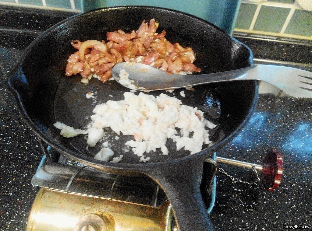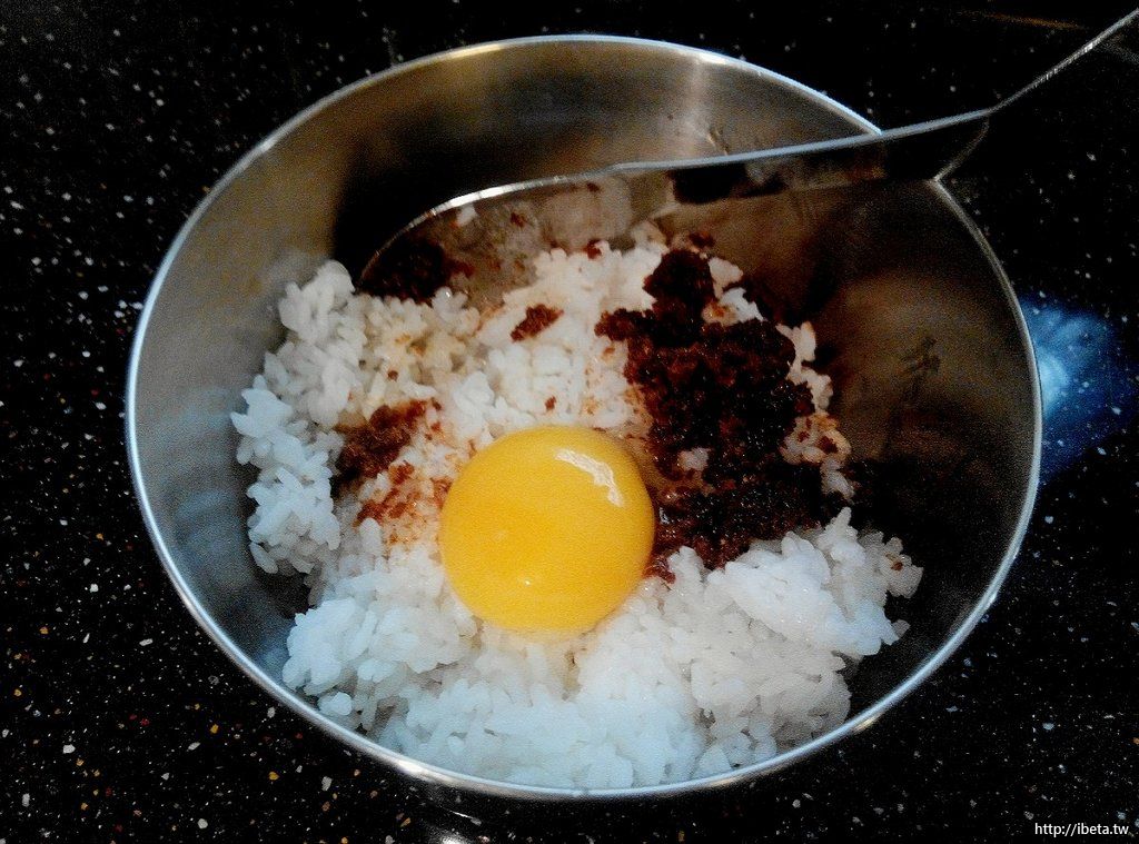 打顆蛋,蛋白留用。取蛋黃置於冷飯中,並加入適量沙茶醬。