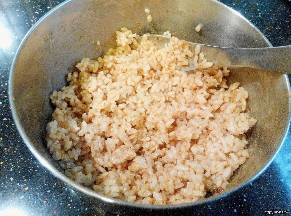 將冷飯、蛋黃、沙茶醬,抓拌均勻。