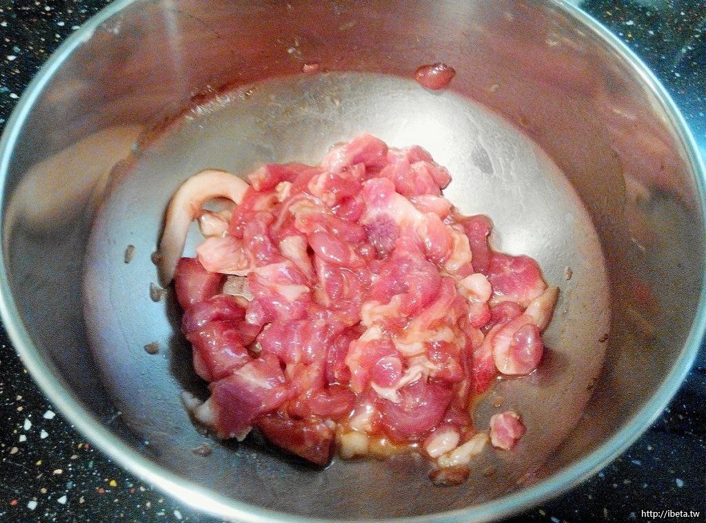 肉絲以醬油、胡椒粉略醃後,加入少許太白粉抓拌均勻。