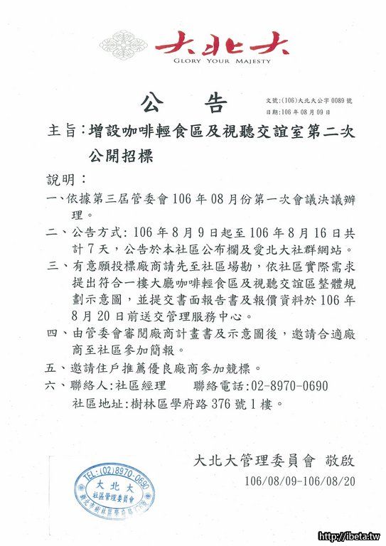 大北大社區增設咖啡輕食區及視聽交誼室第二次公開招標