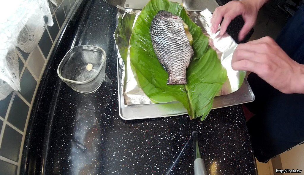 潮鯛洗淨,腹腔內塞入檸檬、蒜、薑。
