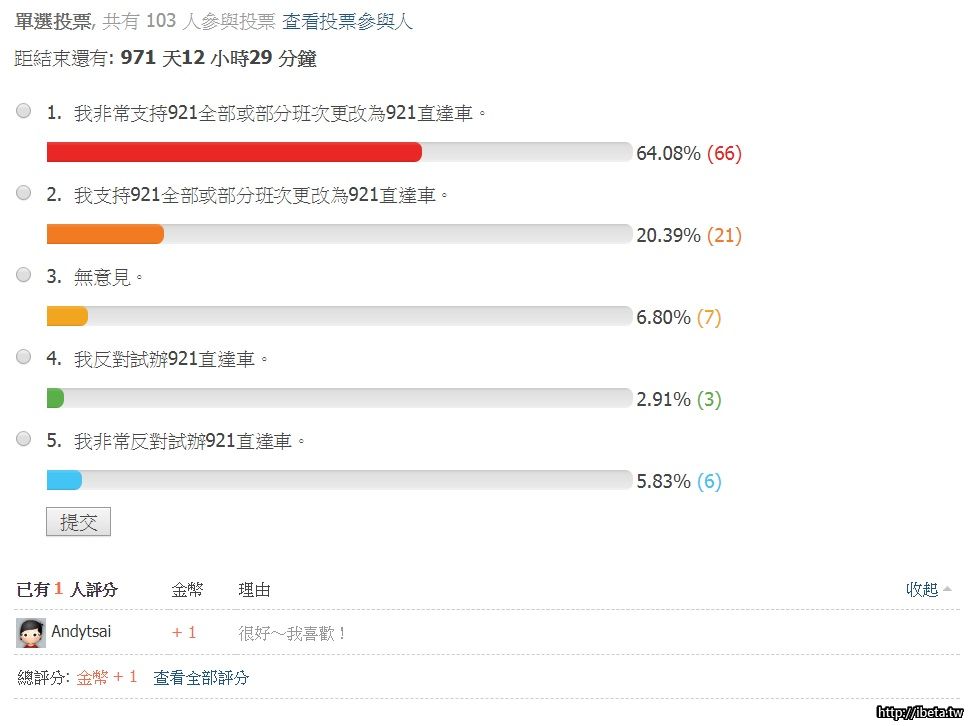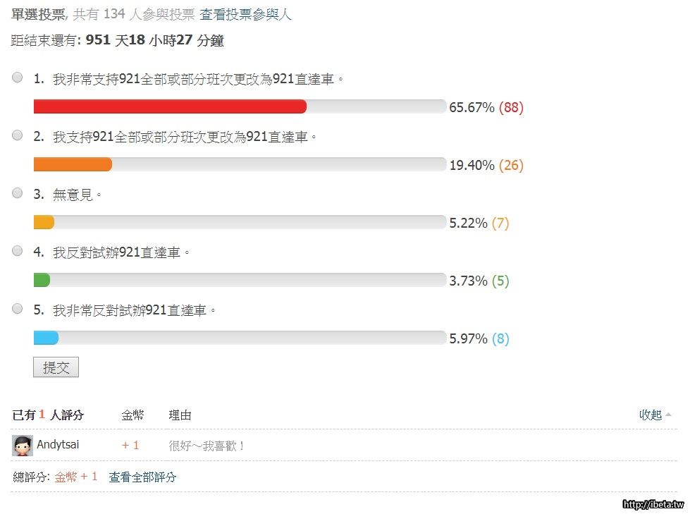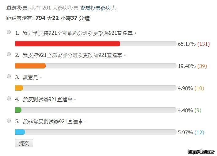 4.因為本投票攸關每一位投票人之權益,且[backcolor=yellow]不公開投票參與人[/backcolor],因此無論支持者或反對者都能依己意投票,透過此投票[backcolor=yellow]足以準確推測多數乘客希望試辦[/backcolor]921直達車。