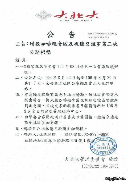 大北大社區增設咖啡輕食區及視聽交誼室第三次公開招標