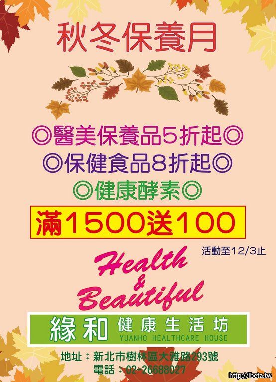◎緣和◎<活動公告─《秋冬保養月》:醫美保養品5折起、保健食品8折起、健康酵素→滿1500送100>