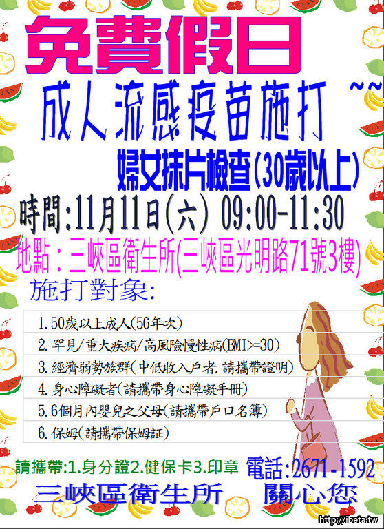 11/11(六)三峽衛生所成人流感疫苗接種暨抹片檢查