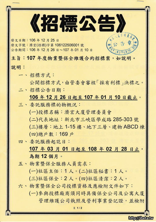 濟宏大廈-107年度物業暨保全維護合約招標案公告