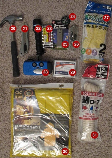 21、26: 大把美工刀、鋒利短刀(First Respond Knife,十分鋒利),或者多功能瑞士刀,除了能夠即時切斷物品,防身也是很重要的。