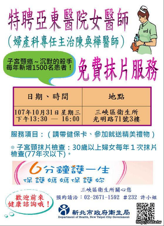 三峽衛生所10/31(三)免費女醫師子宮頸抹片檢查