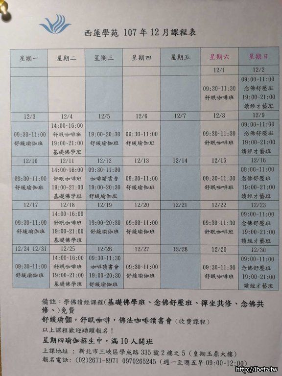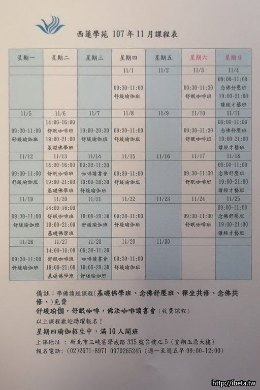 西蓮學苑 2018年11月課程表