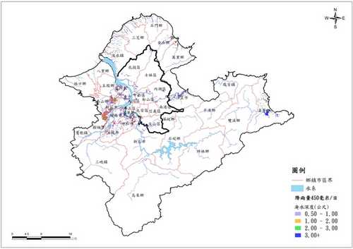以下4張圖分別是單日24小時降雨量為150mm、300mm、450mm跟600mm時,可能淹水區域的示意圖,很明顯的,即使單日降雨量達到600mm,三峽也沒有淹水的迫切危機,代表三峽比較不用擔心降雨量過大帶來的淹水危險,但大漢溪以及石門水庫仍然值得我們注意。