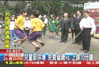 小朋友展現絕技,用一字腿踢毽子,郝龍斌開心的猛叫好,還下場跟小朋友一起玩。真的童心未泯,郝龍斌跟小學生們玩在一起,也宣布今年兒童節,台北市的小學生們憑學生證可以免費搭貓纜,送給台北市的小朋友一份兒童節大禮,新北市的小朋友不能免費搭纜車,但收到的禮物,很不一樣。