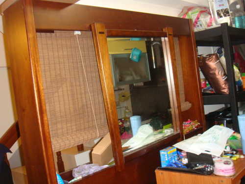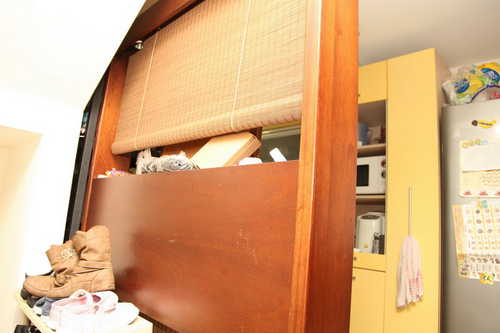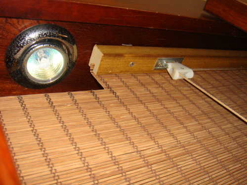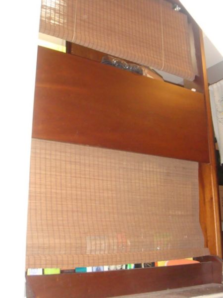 鏡子後面的簾子可以手拉升降,鏡子也可獨立取下使用,上簾子左右各側有灯(買來時它會亮,但因為都沒使用過,應該還是好的)