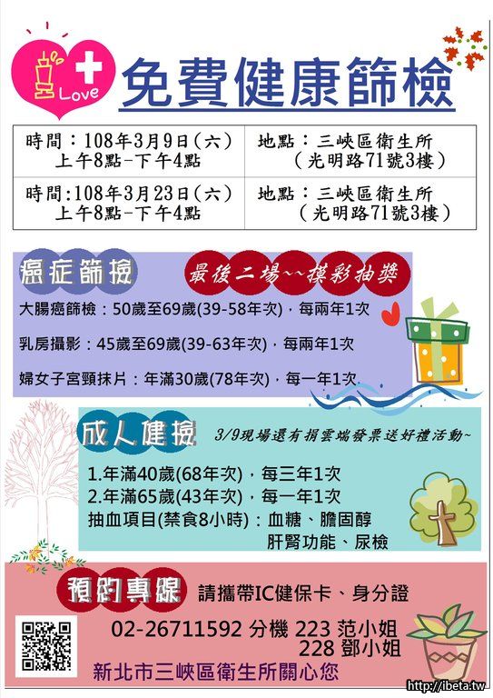 三峽衛生所3/9、3/23(六)假日成人健檢