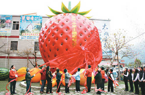台灣燈會水果燈區的大草莓移置到大湖酒莊永久典藏,昨天熱鬧揭幕。