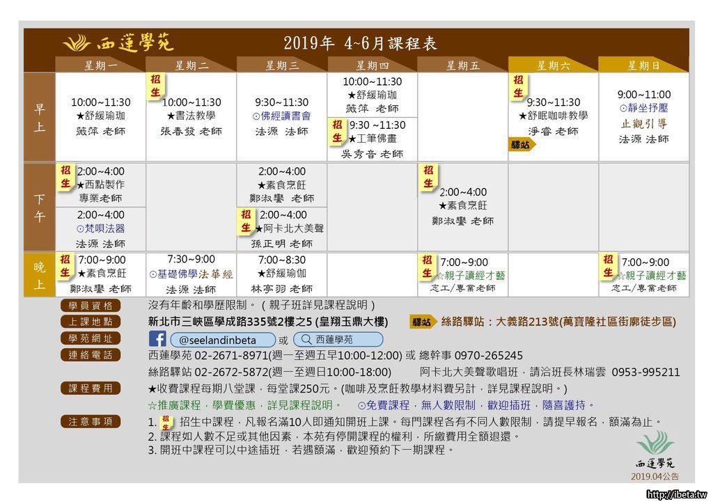 2019年4月~6月課程表.佛經.佛畫課.瑜伽課.烹飪課...