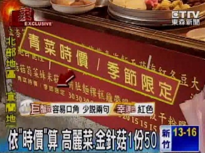 因為這一行小小的字註明,菜類依「時價」計算,像這盤高麗菜50元,金針菇也要50元。民眾:「如果買四樣吃完200多元,我不能接受,有可能是太貴了。」 業者:「成本用比較高,因為都是真材實料香菇,現在一般都是50元,一盤一份,算時價,幾乎都沒有調漲過,也沒有降過都賣這樣子。」
