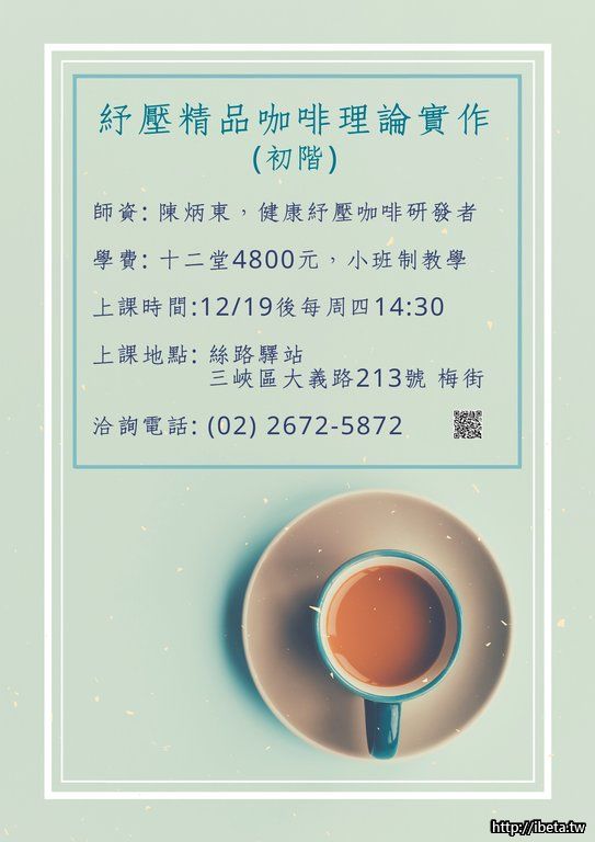 師資: 陳炳東,咖啡教學二十餘年,十多年前因身體亮起紅燈而改變對咖啡認知,歷時三年不斷嘗試錯誤,最終研發出健康紓壓咖啡,並經心律儀反覆實測,身體逐漸恢復健康,後被稱為咖啡教育的改革者,目前致力於健康紓壓咖啡的推廣。