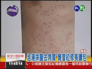 照片中的男子,背後都是紅疹,一顆顆小紅疹又紅又癢,有些還長出膿泡,另一名患者也是,身上一大片紅斑疹子,癢到受不了,連晚上也睡不著,他們都是感染了綠膿桿菌毛囊炎,而同樣的原因,都是泡湯所引起的,原來他們是到大型游泳池,裡頭都有熱熱的泡湯池,就像這位小姐一樣,他們先在蒸氣室內用大量的鹽巴,拼命搓揉身體,以為這樣可以去角質,讓皮膚更細嫩,卻沒想到,鹽巴用力搓抹全身的同時,已經造成皮膚有細小傷口,這些傷口可能肉眼還看不到,但是接著泡在熱水中時,就會很容易造成細菌感染。