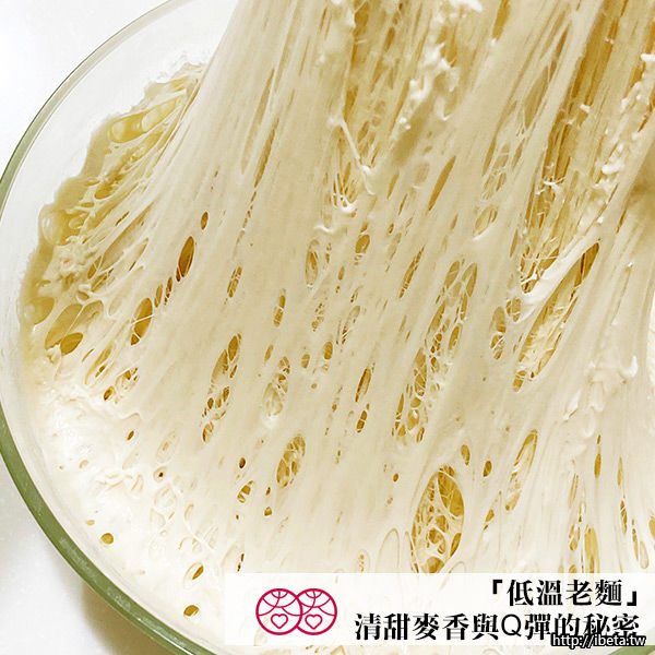 【低溫老麵】發酵帶出Q彈淡雅口感;老麵中乳酸菌能防止胃酸脹氣