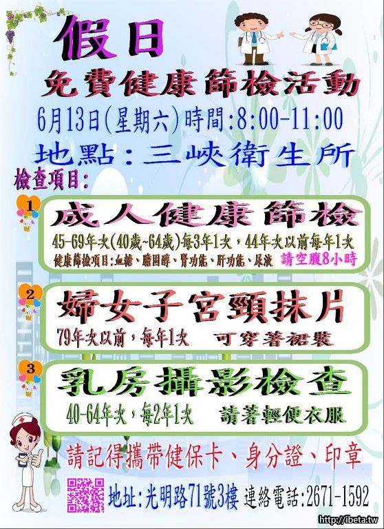 三峽衛生所6/13(六)免費成人健檢