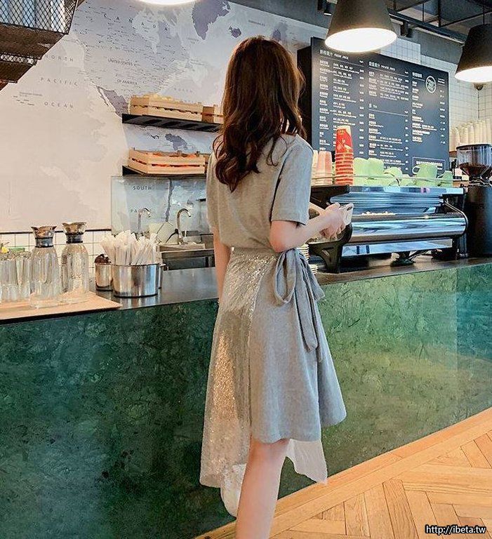 全新一字領露肩綁帶收腰亮片連身裙(兩件式)