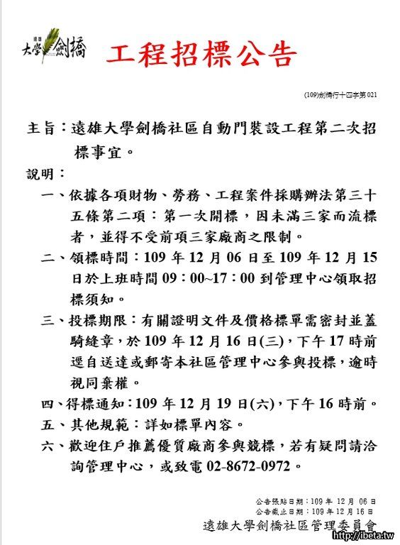 遠雄大學劍橋社區自動門裝設工程第二次公開招標事宜