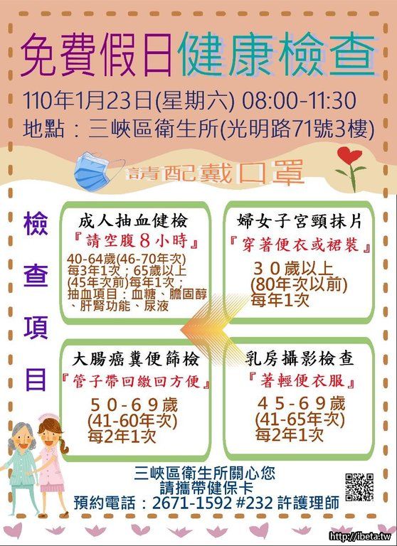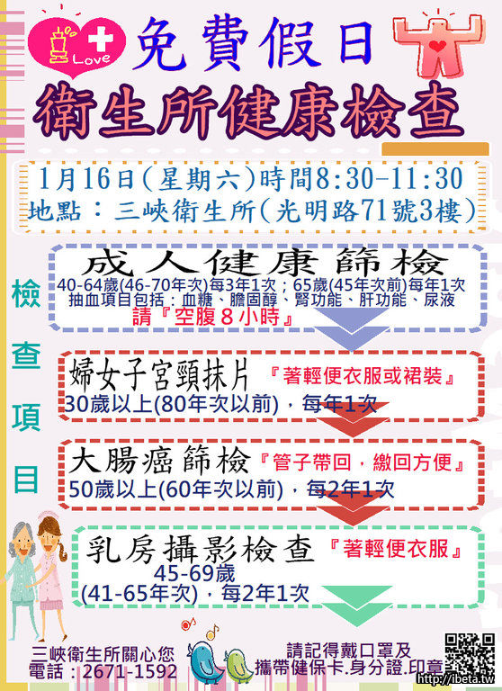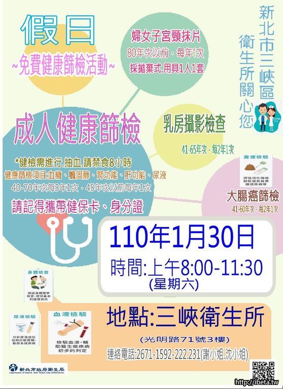 三峽衛生所1/16、1/23、1/30(六)假日成人健檢