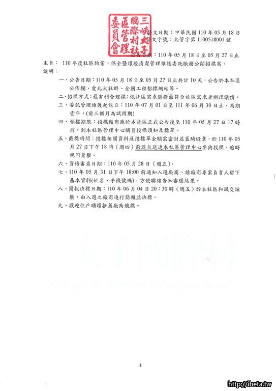 110年度社區物業、保全暨環境清潔管理維護委託服務公開...