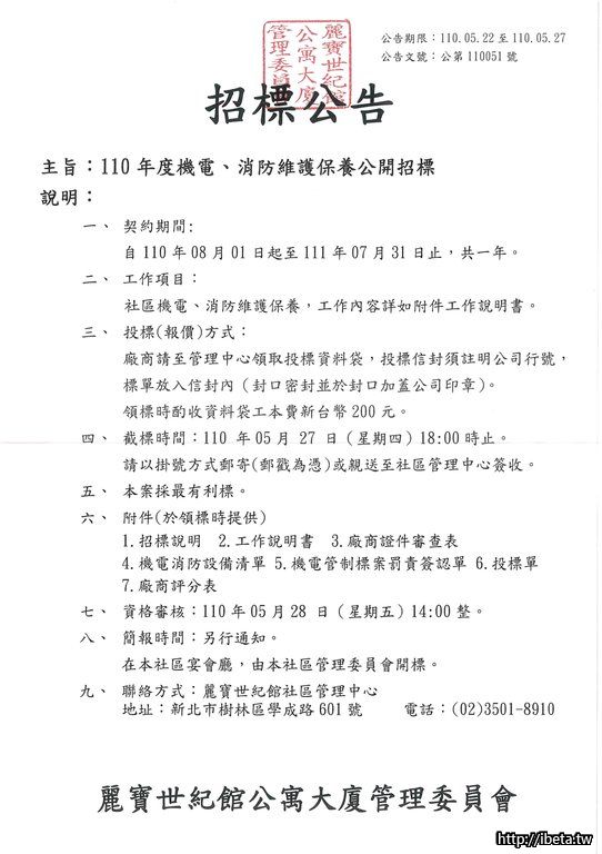 主旨:110年度機電、消防維護保養公開招標
