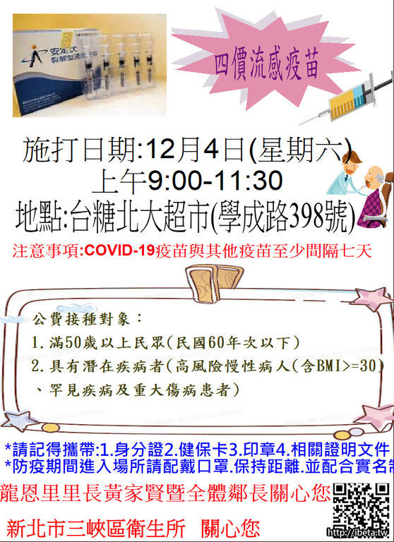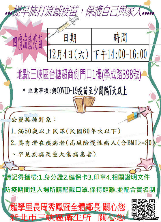 三峽衛生所12/4(六)成人流感疫苗接種-學成路