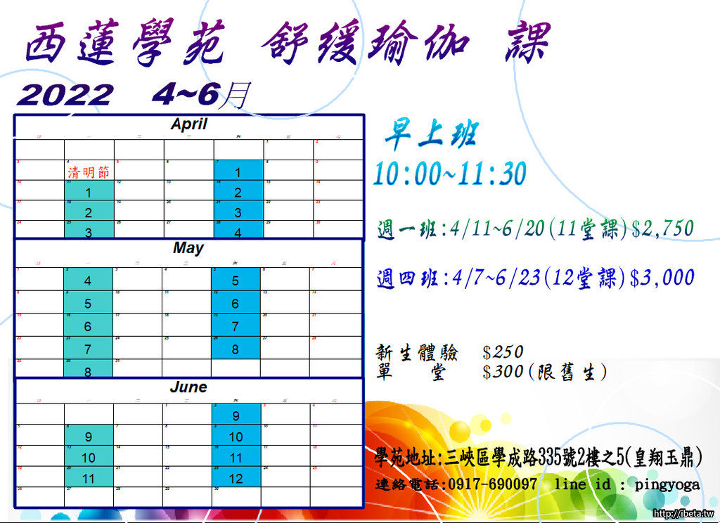 時間:每週一.四早上10:00~11:30. 名額 : 限10人