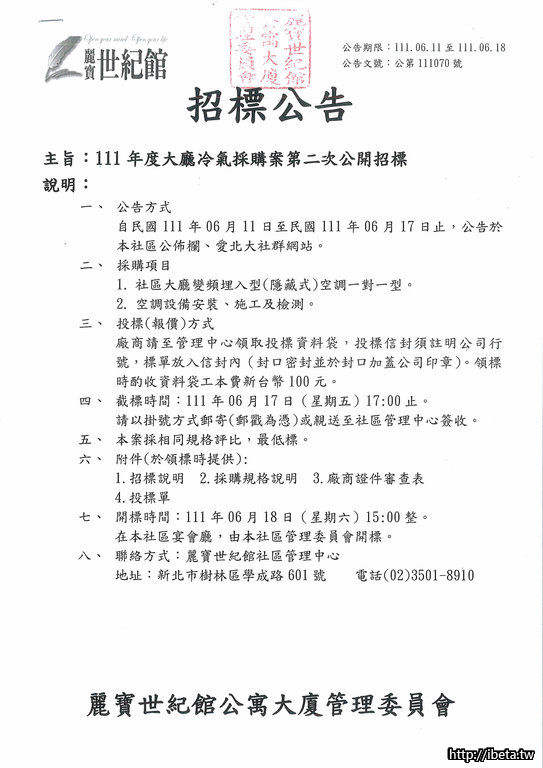 主旨:111年度大廳冷氣採購案第二次公開招標