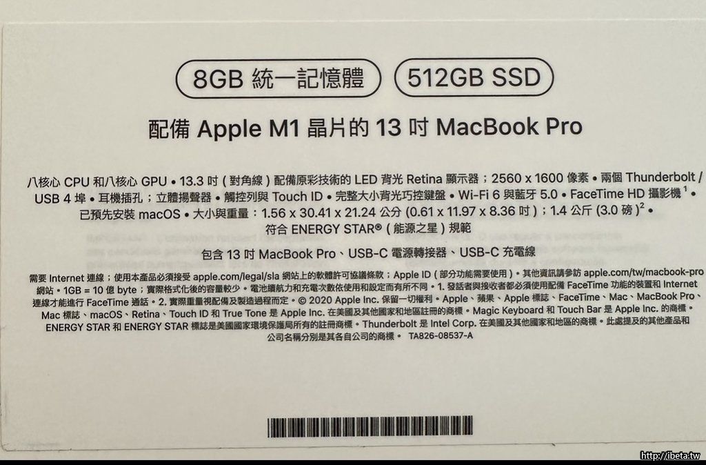 Apple Macbook Pro M1 13吋A2338 8G/512GB,