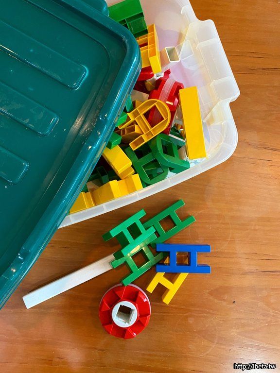 此種積木可自由組裝成有輪子的車子或可移動的裝置等,當初於百貨公司購入。