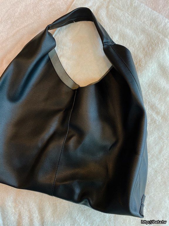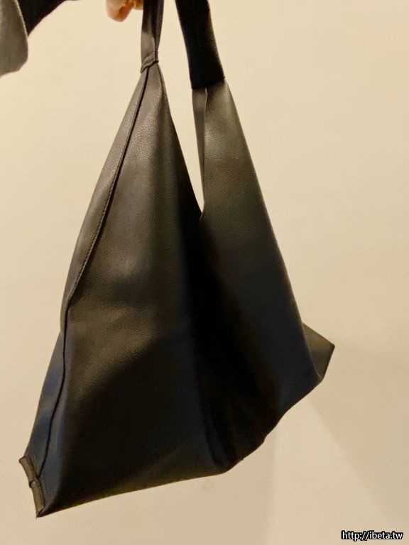 容量很大,可裝得下水壺、摺疊小傘等。材質為軟的黑皮革。