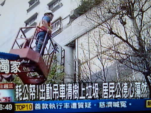 到底是誰丟垃圾?環保局也想查個清楚,想要從垃圾裡面下手,看看裡面有沒有帳單、廣告單之類可以從地址去查,結果把垃圾拿下來發現一看,都是一些便當盒、飲料罐,很難去找誰丟的,不過這垃圾實在被掛的太高,環保局人員還得出動吊車,才能把垃圾拿下來。