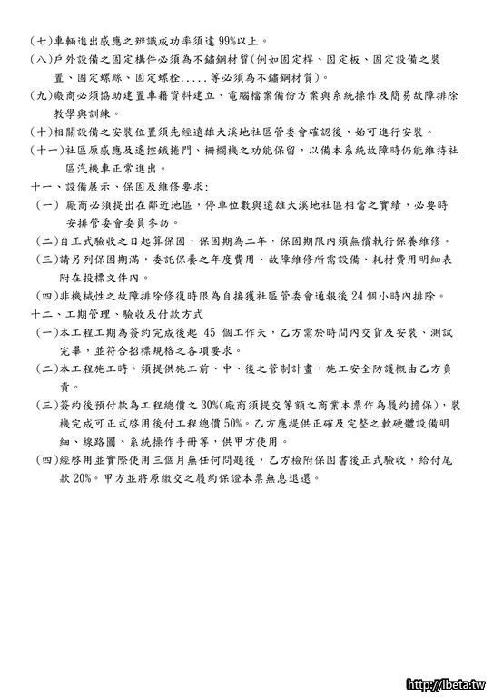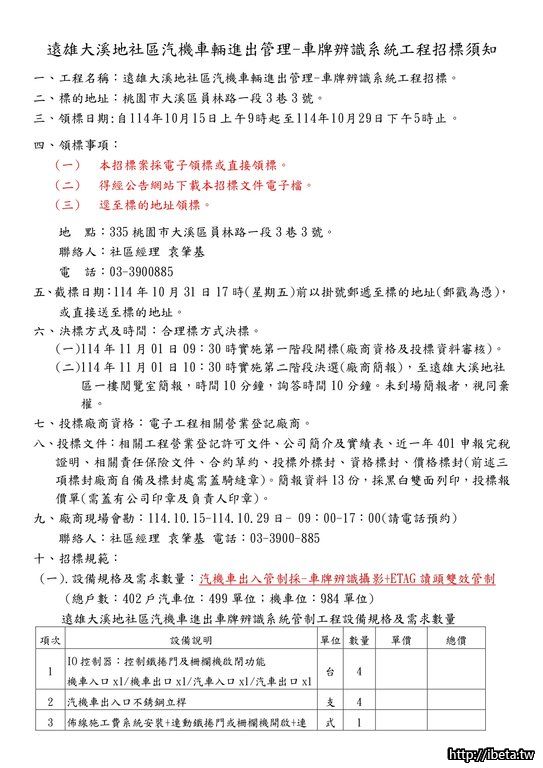 主旨:遠雄大溪地車牌辨識系統工程第二次招標公告