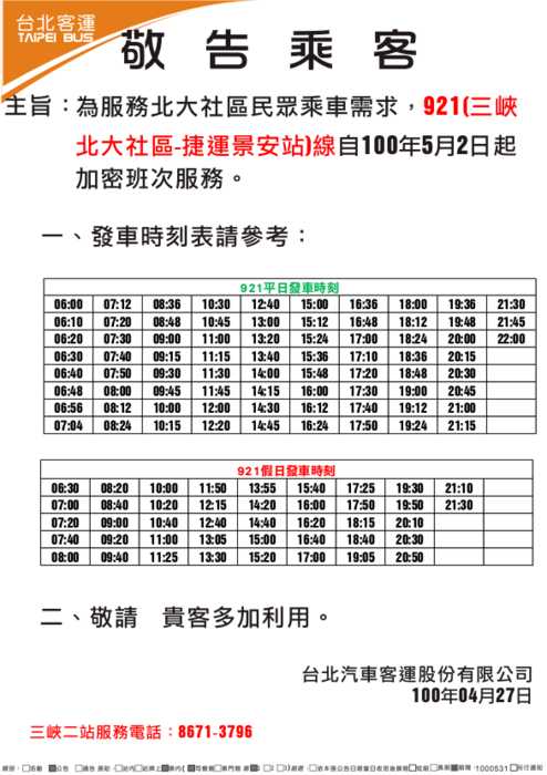 921、922等線自100年5月2日起加密班次服務!!!