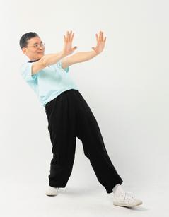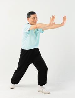 3.腳呈弓箭步,雙手打開掌心向前,手指上下擺動。