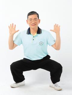 要領:雙腳應確實張開,反覆蹲下站起才能維持身體穩定;年長者蹲低動作應放慢速度,以免增加下肢負擔。