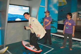 北觀處北海岸遊憩探索館昨天開幕,來賓穿著西裝岸上衝浪,體會遨遊大海的樂趣。