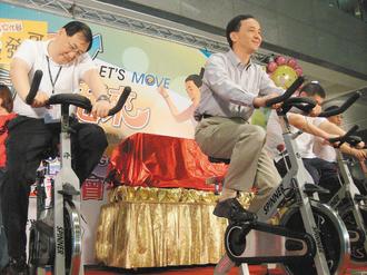 新北市長朱立倫今天上午率市府團隊騎著飛輪自行車「尬車」啟動全民減重計畫,號召新北市民總動員,一起甩掉136公噸體重。