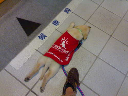 因為他還算幼犬 所以目前都只是社會化及服從訓練 導盲的階段至少要一歲多才會開始訓練 不過是因為他現在還小不佔空間 否則成犬體型可是很大 像他這樣的趴法 在尖峰時間的車廂內可會被踩扁的