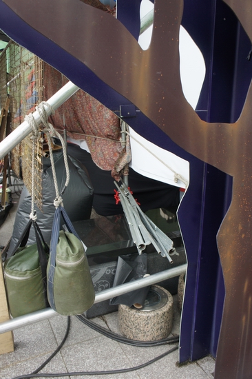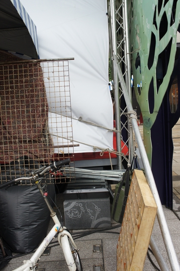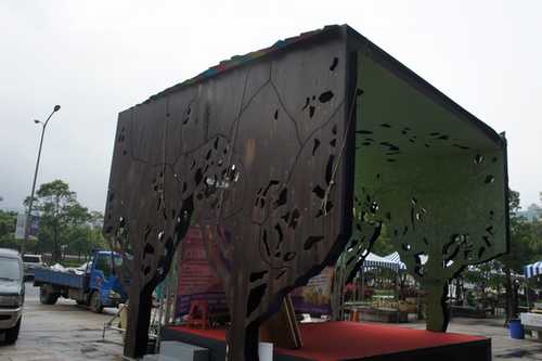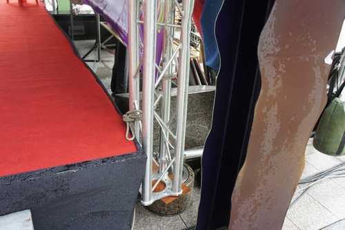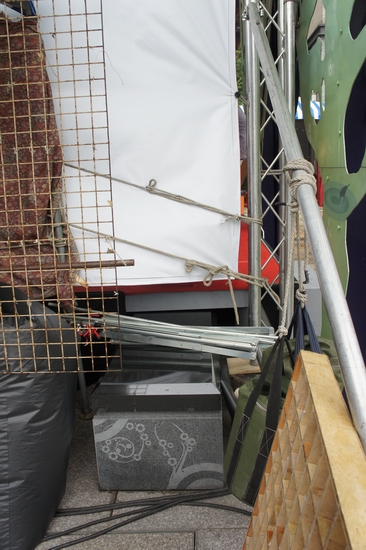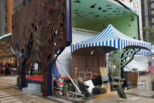 依本人淺見.樓主所要表達的是公共藝術品的維護問題.這真是值得大家重視.其他單位辦活動是會另搭舞臺.這次活動居然利用公共藝術品來搭蓋.最上面放置塑膠布.再用繩子綁在兩側公共藝術品的空隙.風又蠻大的.拉力應不小.鋼架柱子放在燈具的保護罩上.隨文附上幾張相片.還是建議主辦及其他單位不要這樣對待公共藝術品.這個公共藝術品應該是花費不少.破壞再來修補好嗎?