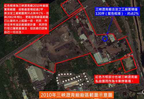從2010年廠區範圍可以發現三峽瀝青廠嚴重的違建事實,合法面積已不到工廠總面積的2%,儼然是個超級大違建。但市府不僅漠視三峽瀝青廠從2002年即非法占用農牧用地及違建的惡劣違法行徑,截至今日仍不願勒令該廠停工,讓人非常遺憾,也對政府公信力打上一個超級大問號。