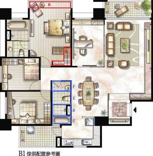 2.感覺客浴的空間太大,且我不需要客浴的浴缸,曾想過儲藏空間可從此處下手改造,即C變淋浴間,D變馬桶,E區馬桶對面做洗手台,原馬桶的位置做成客浴的隱藏門,這樣F就可成為一儲藏空間了。但有長輩是建議馬桶位置最好不要改,因為這樣進出都會在別人的馬桶下方,且客浴的門最好不要面對餐廳。也曾想過直接把浴缸打掉,再從廚房開一個門進來讓C成為儲藏間,但這樣浴室就沒開窗了,所以不考慮。不知道有沒有大大有更好的構想呢?