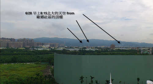 6/28今早,我帶著趕著上班的心情出門,經過三峽瀝青廠,發現早上沒有拆除的動作,想說,好吧,就等一下吧.看拆除工人是否會來.等著等著,看到北大社區的上空,疑~~ 怎麼黑黑的.. 請看下圖...