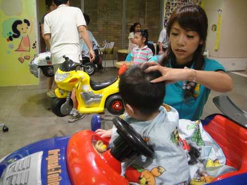 有次去橘子吃早餐,回來時經過國學街上的尚田,裡面就有車子造型的剪髮椅,但是剪髮時,車子會被那件擋頭髮的布蓋住,所以就不能看到車子,要不斷跟小孩說,剪好就可以再玩了。那天大少馬上就乖乖的剪頭髮了。